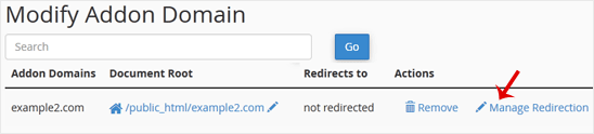 3. Under Modify Addon Domain, locate the add-on domain and click on Manage Redirection.