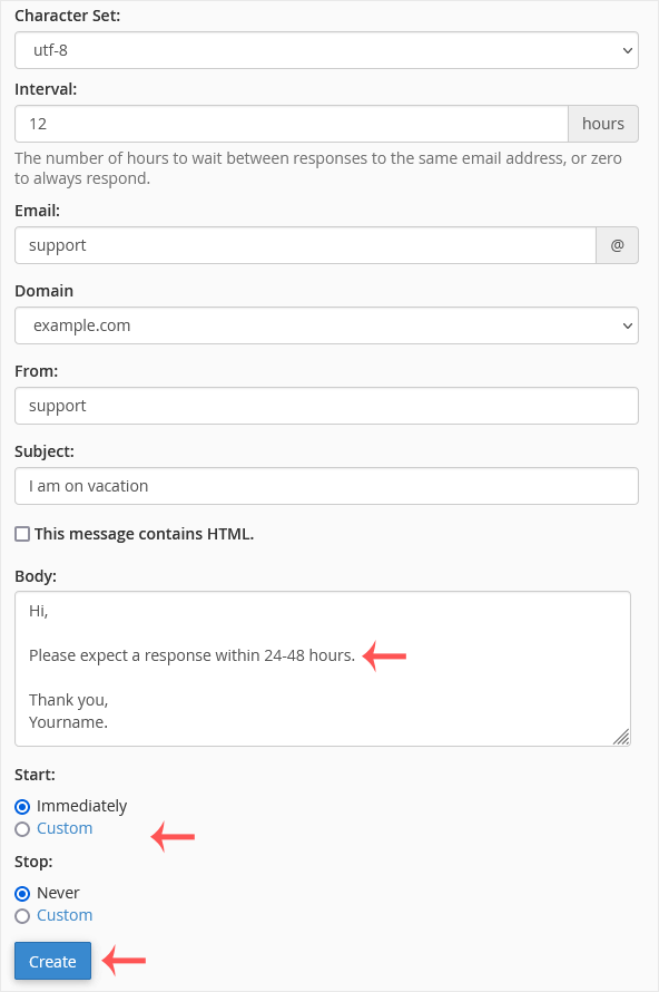 - Interval: Specify the number of hours you wish the autoresponder to wait between responses to the same email address.
