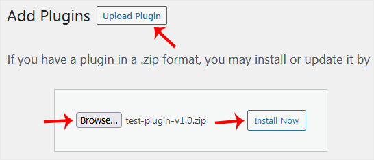 3. Click on Upload Plugin and then on Browse. Choose your plugin's zip file and click Install Now.